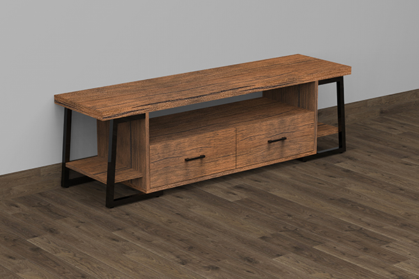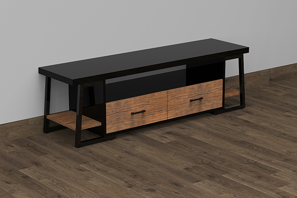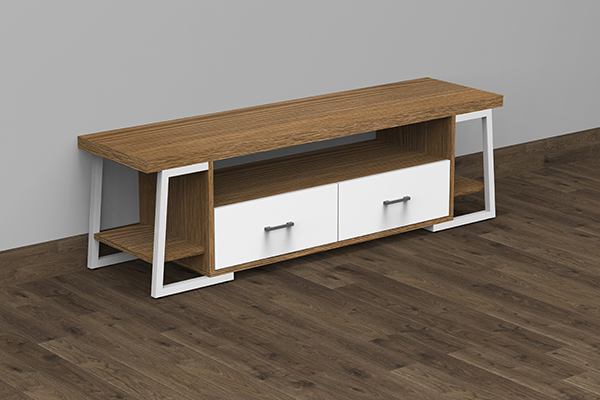 This simple piece for holding your TV features raw materials: imitation wood and metal. Every surface of this multimedia storage unit is finished. The TV stand is accented by metal details: the handles and legs. An elegant designer type piece in your living room!